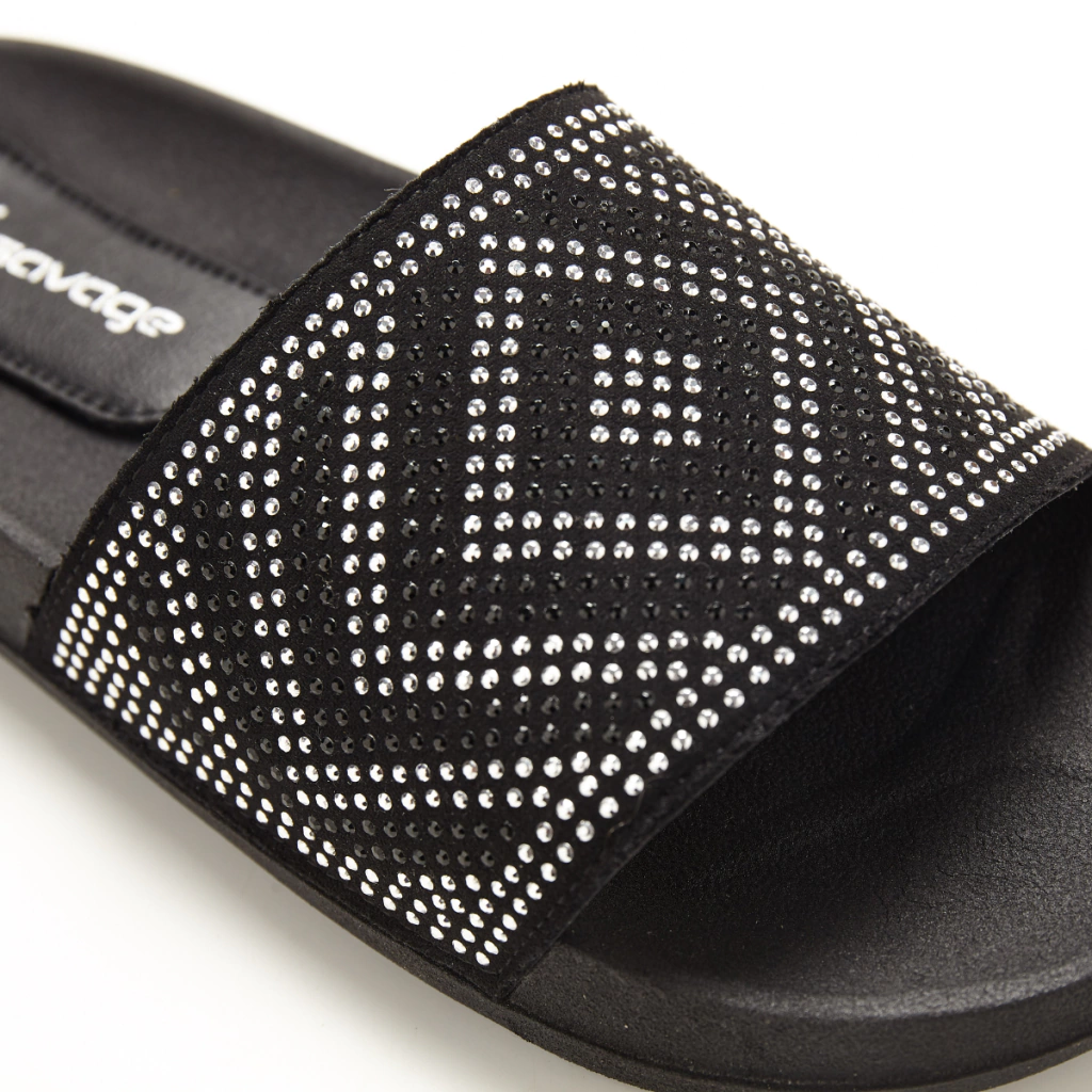 Sandalia Puri es la elección perfecta para quienes buscan comodidad y un toque de elegancia. Su capellada está adornada con strasses negros y plateados, que aportan un brillo sutil y sofisticado.